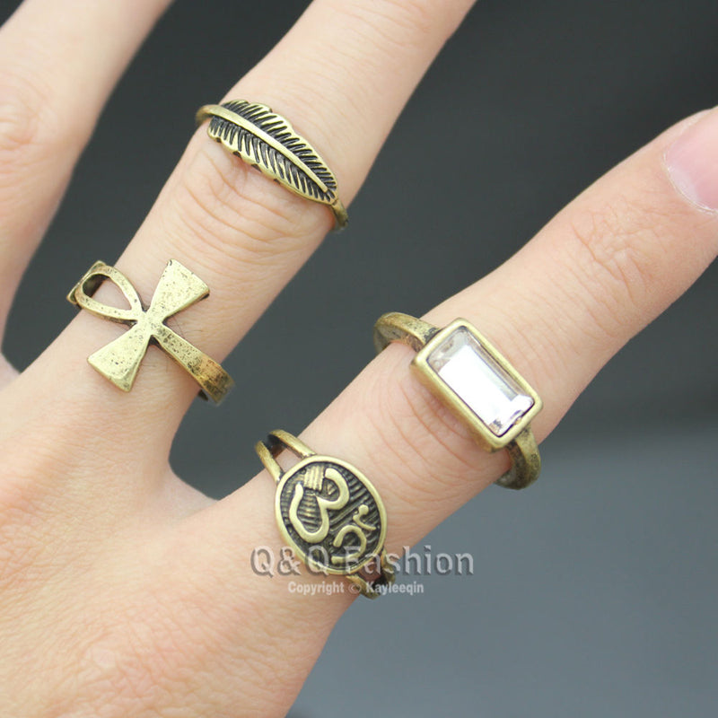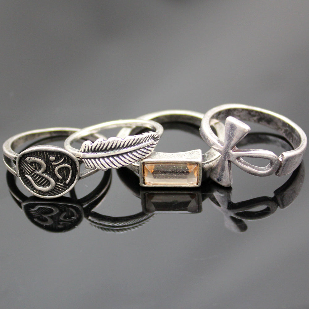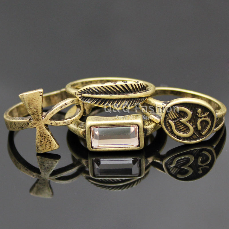 Vintage Gold Silver Egyptian Ankh Cross Key Life Hindu Indian Om Ohm Aum Feather Leaf Rings Set for Women Men Jewelry